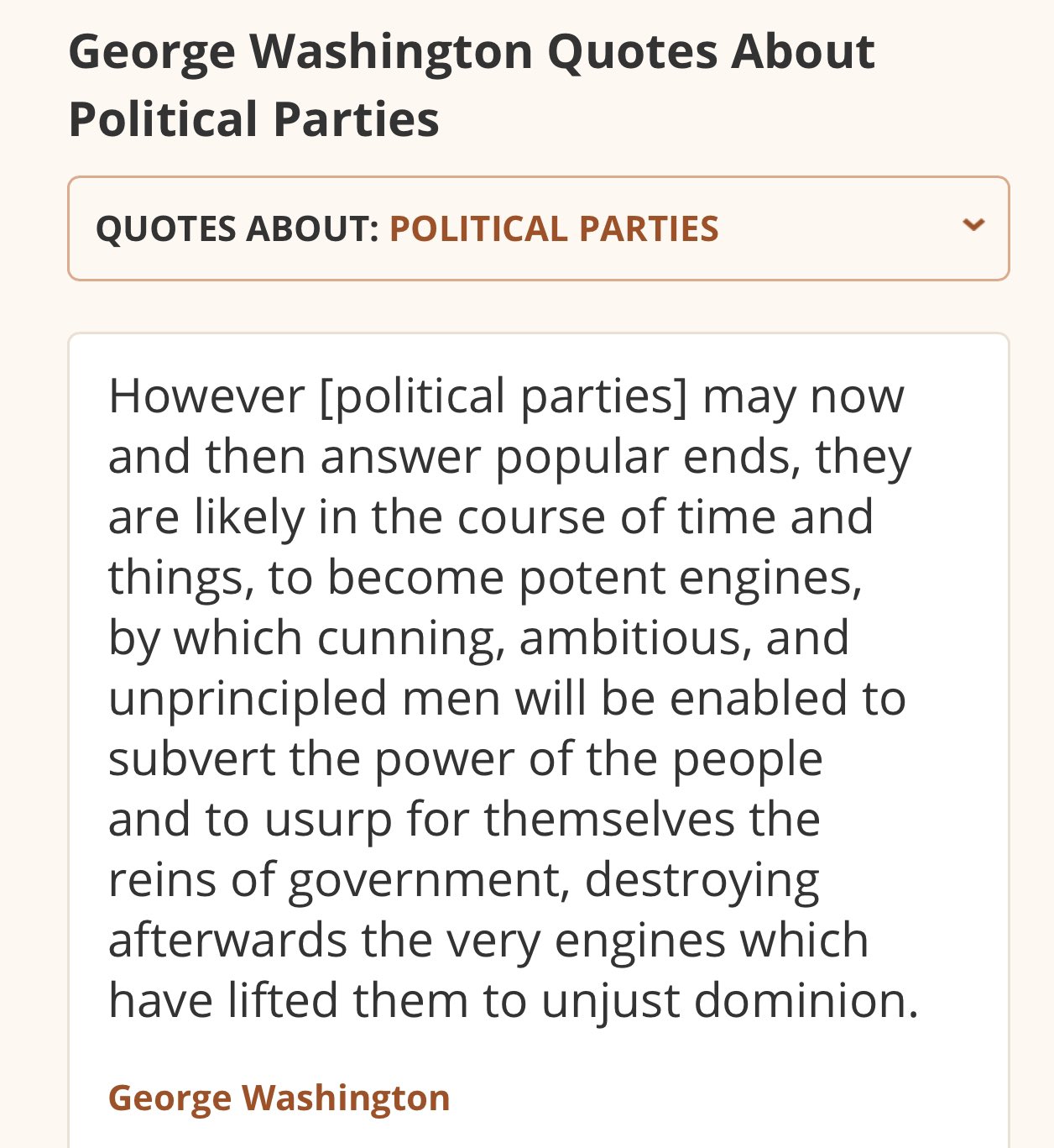 George Washington’S Quote On Political Parties – Unsurmountable obstacles caused by time and space cause us to ignore the wisdom of our Founding Fathers. Our first President George Washington is an example. . The Constitution does not mention political parties, yet they play an important role in U.S. government Federalists and the Anti-Federalists. George Washington specifically warned against .