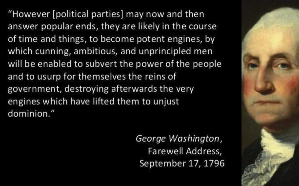 Washington Quote On Political Parties Jay Mcfarland If George Washington could see America now, would : The Constitution does not mention political parties, yet they play an important role in U.S. government. They began to emerge with disputes over the ratification of the Constitution, becoming . A famous quote by Franz Kafka says, โEvery thing you love is very likely to be lost, but in the end, love will return in a different way.โ The same .